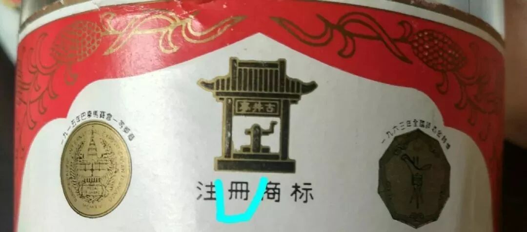 假“汾酒”的字,表面无亮光,且与圆圈接触,两枚奖牌图案印制粗糙,模糊,字迹普遍模糊而无光亮,亭顶黑线可能不是16条,亭檐下“古井亭”三字很难看清楚,注册商标上的“册”字写法与真品不同。