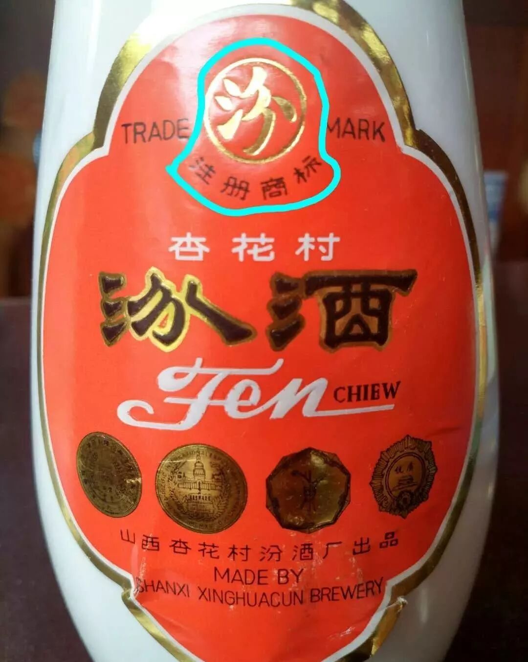 “汾”字金黄透亮,与周围圆圈无接触处,商标两边的英文字母清晰。