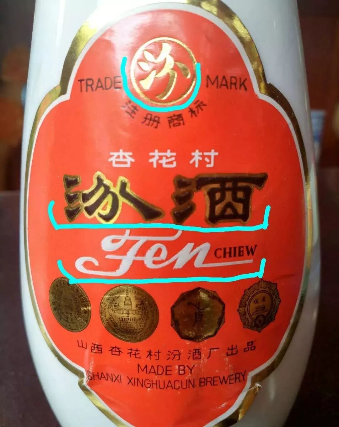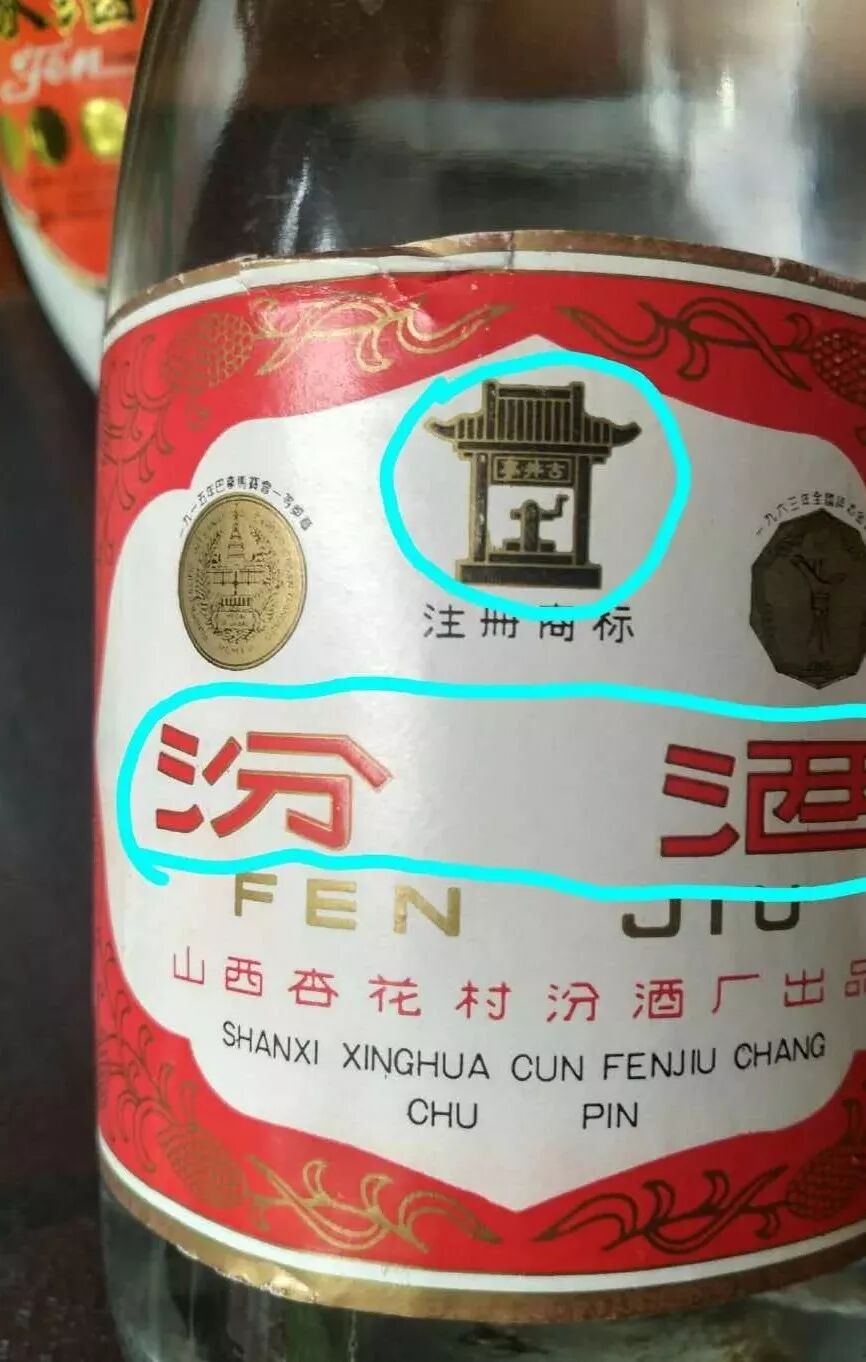 汾酒标签上的古井亭商标,“汾酒”及“FFN JIU”字样,手摸有凸 出感。