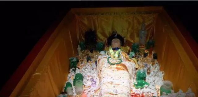 慈禧的身边还有翡翠白菜两颗,匠人巧妙运用了玉料本身的色彩变化,雕出一颗浑然天成的白菜。白嫩的菜茎,翻卷的菜叶,绿叶旁边还有两只黄色的马蜂,形象极为生动逼真。栩栩如生,其价约1000万两白银,现在已经是无价之宝了,还有一件翡翠荷叶与四个甜瓜,翡翠荷叶满绿碧透,精美无比,从而构成了“步步生莲花”的意境还有玉佛27尊,有人估计这些翡翠的价值可达数千万两白银,可谓价值连城。