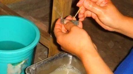 对许多精细雕刻的产品,小坑洼的地方得一点点扣,经常用到的就是牙签了。