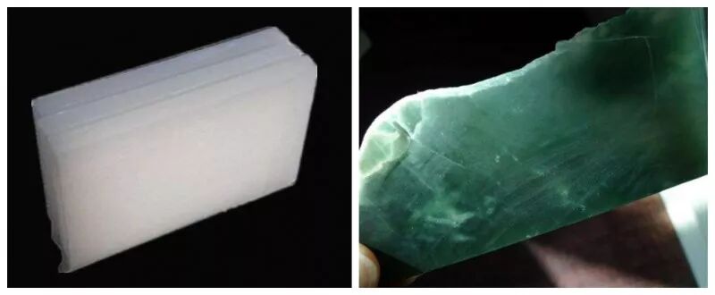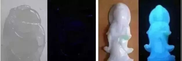 左图上蜡翡翠在荧光灯下,右图浸蜡翡翠在荧光灯下