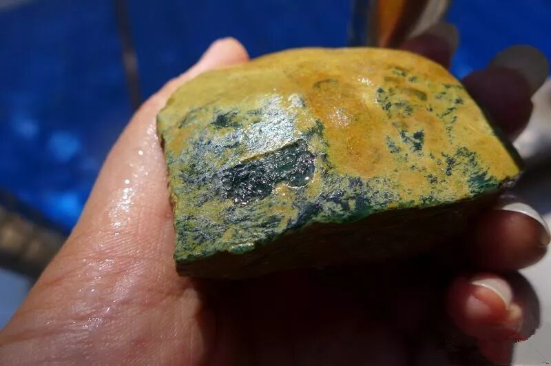 石头黄壳黄雾且皮薄,油性很大,温润细腻,色味偏蓝,这是宝主所看重的,所以才毫不犹豫拿下!