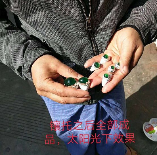 看看这一手镶嵌好的戒面,种水好水头足,颗颗起莹光,没有一点瑕疵,戒面鼓满,光泽和颜色都充分展现出来了。