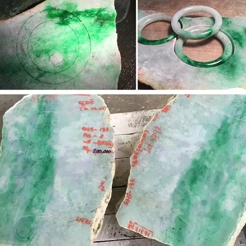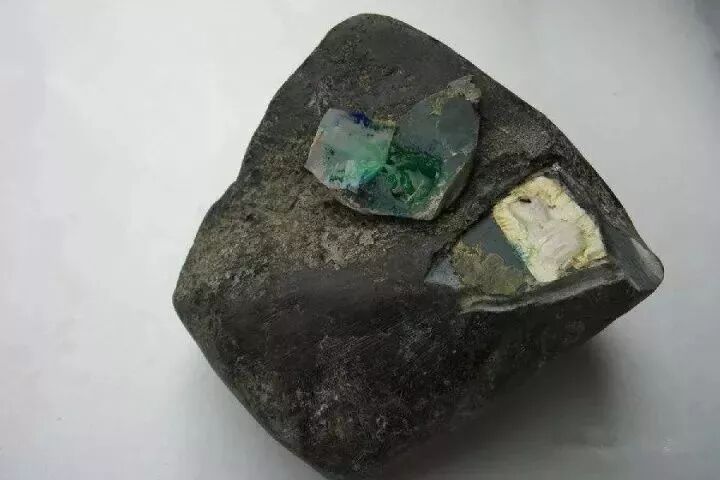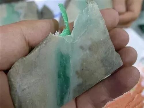 第一种,石头顶层均为无色翡翠,中间用一薄片绿玻璃或一双面皆绿的薄片粘合而成。