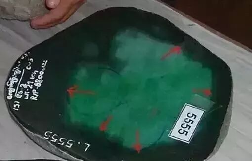 在赌石的时候,原石表面,如果出现有“猫尿”,说明具有“猫尿”的地方一定是具有次生绿色的地方,颜色会出现暗绿色、蓝绿色,偏灰、偏暗,种水会相对于其他部位都要好。
