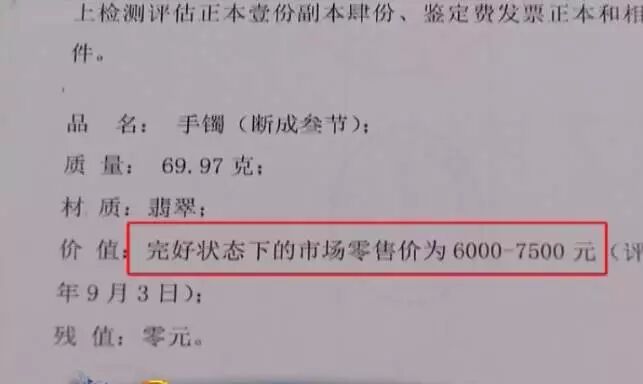 之后由权威机构对这只玉镯进行评估:该手镯在完好状态下的市场零售价应为6000至7500元。产生的1万元评估费用已经由原告方先行垫付。