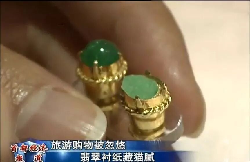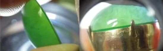 更有“奸中之奸”直接在两块翡翠中间,填充上绿色胶体,和上面同样的效果,还节约了不少成本。翡翠原石中间涂牙膏也是这样的道理。