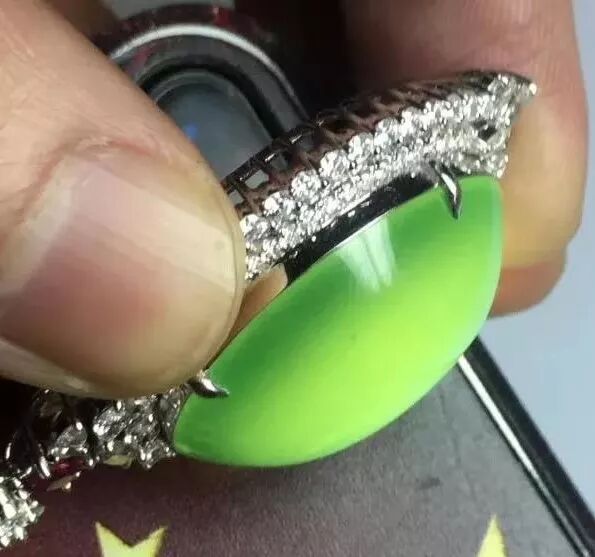 对于镶嵌好的翡翠,要倾斜角度观察它的颜色分布,尽可能使光线投射过翡翠。当颜色没有正常的立体色形时,就要保持警惕。同时观察底部的胶合部位,胶质感强烈也要保持警惕。