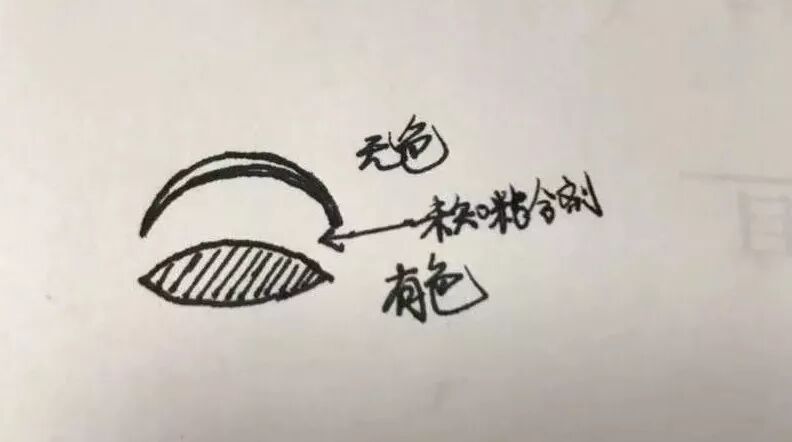 如果三合一翡翠算是拼合一代的话,那奸商们根据“市场反馈”又迅速优化出了拼合二代,也就是开篇提到的两层拼合翡翠。二合一翡翠只有两层结构组成,上层主要体现水头,下层主要体现颜色,比三合一翡翠更隐秘,更不容易让人发现。
