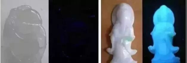△左图上蜡翡翠在荧光灯下,右图浸蜡翡翠在荧光灯下