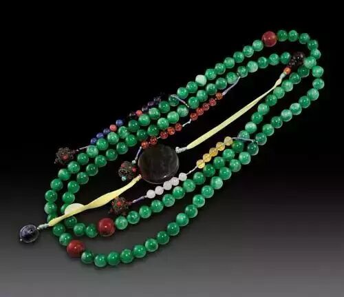 朝珠是清代大臣上朝时礼服上配戴的饰物,朝珠共108颗。用珍珠、珊瑚、琥珀、蜜蜡、玛瑙、蓝晶石、翡翠等制成,其中翡翠朝珠较为罕见,而显得尤为珍贵。