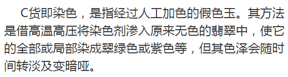 B+C货是指经过漂白、填充、染色的翡翠,既酸洗、漂白、灌胶,又人工染色,外观看起来无论颜色还是水头都很漂亮,但是没有收藏价值。