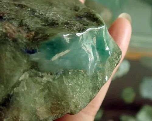 对于翡翠原石中的绿色形状特点来说,“线”的厚度是可以看到的,而深度是未知的:“片”的面积是已知的,而厚度是未知的。