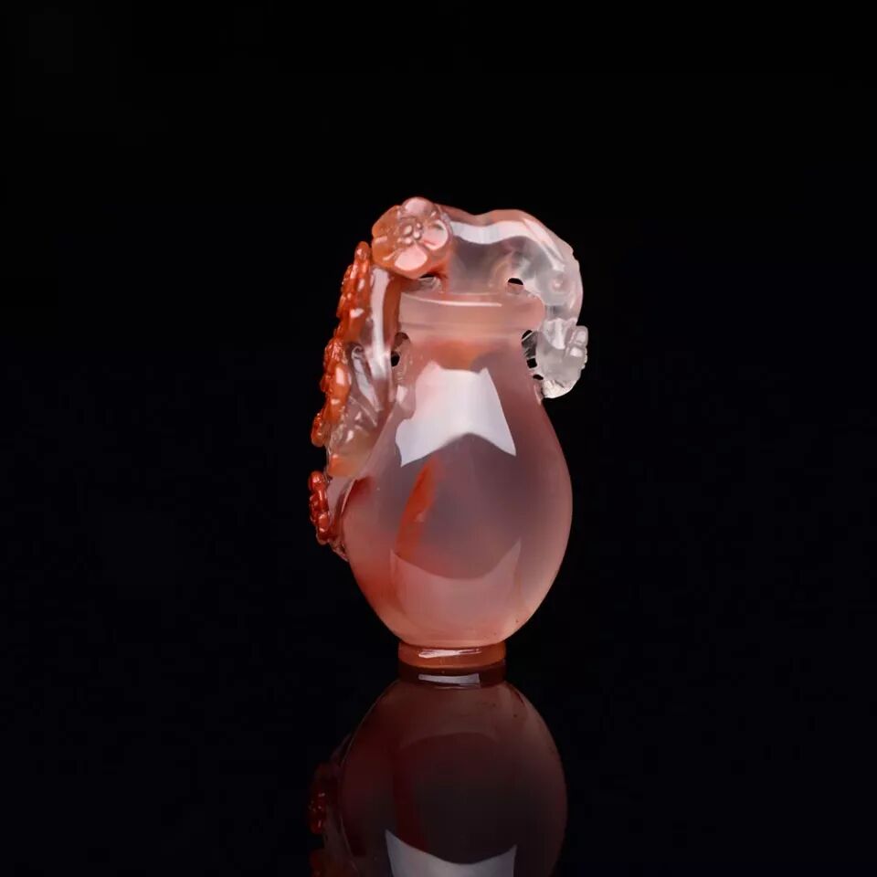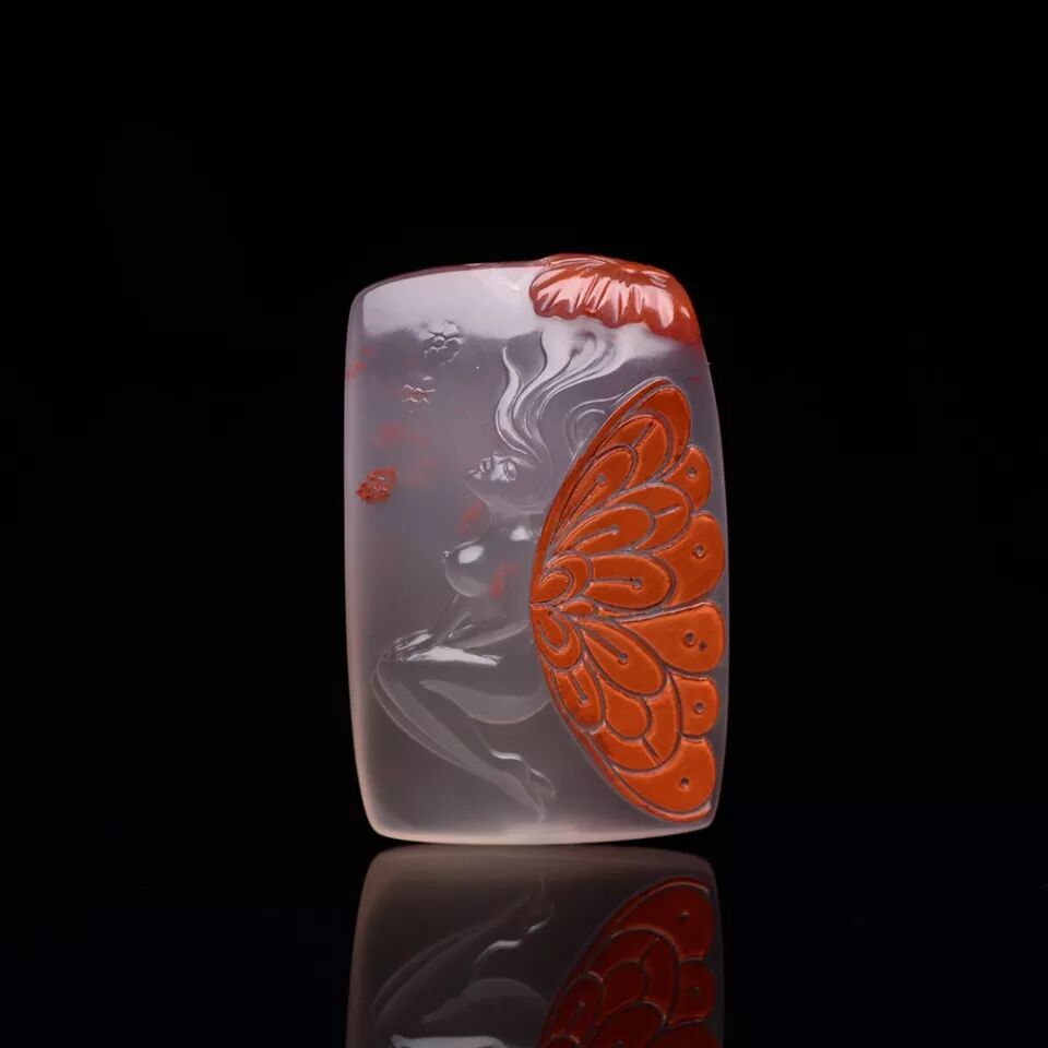 冰飘没有浓郁的纯红色,但也就是由于其整体晶莹通透、甚至不输翡翠的质地而备受关注。凭借自身独特的质感及其雕刻成品出色的品相,在南红市场上,成为了非常流行和受欢迎的南红品种。