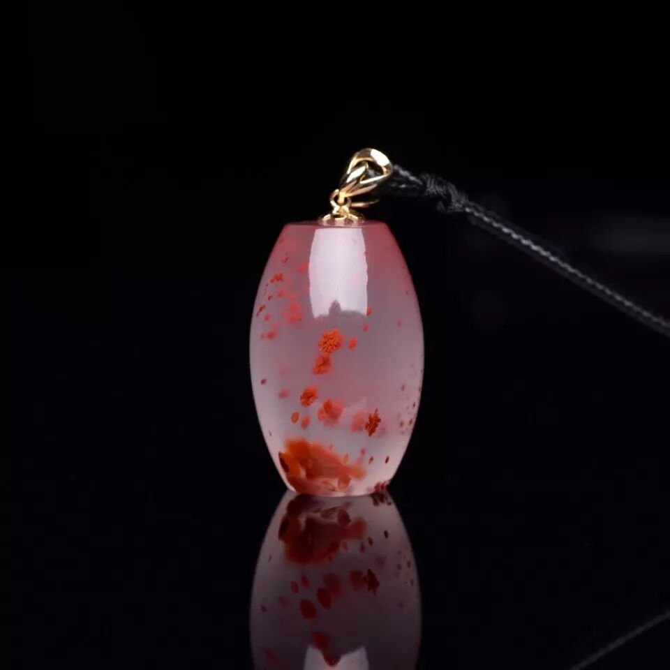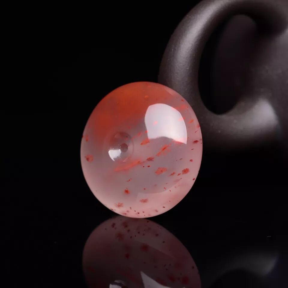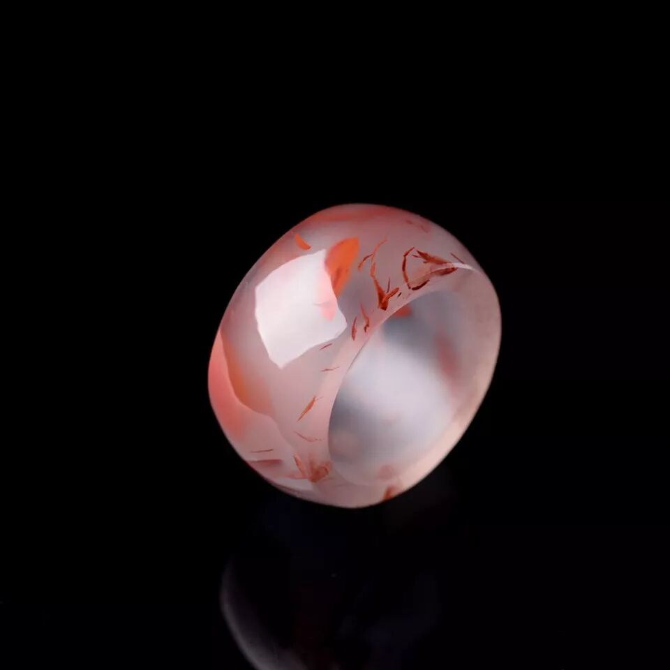 冰飘南红的底色常有高冰,荔枝冻,粉色,黄色或冰地带荧光等底子,冰的底色上飘红飘花或点状块状朱砂点,形成鲜明红白两色的色差,极富有表现力。