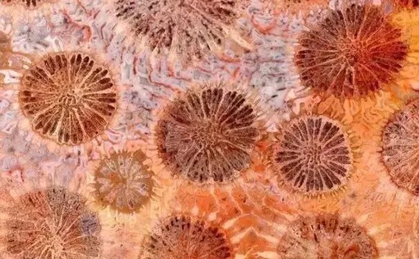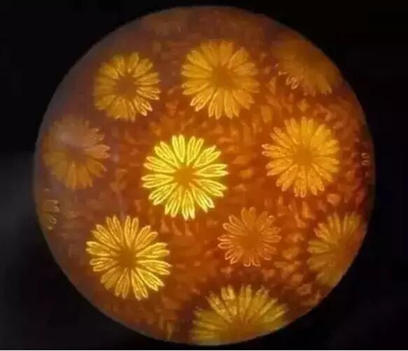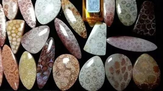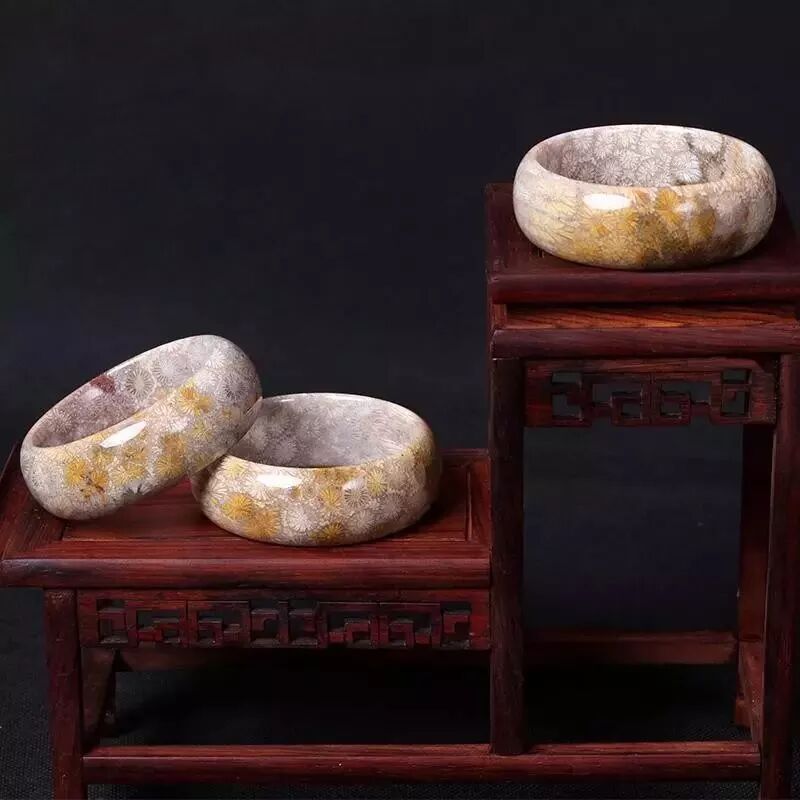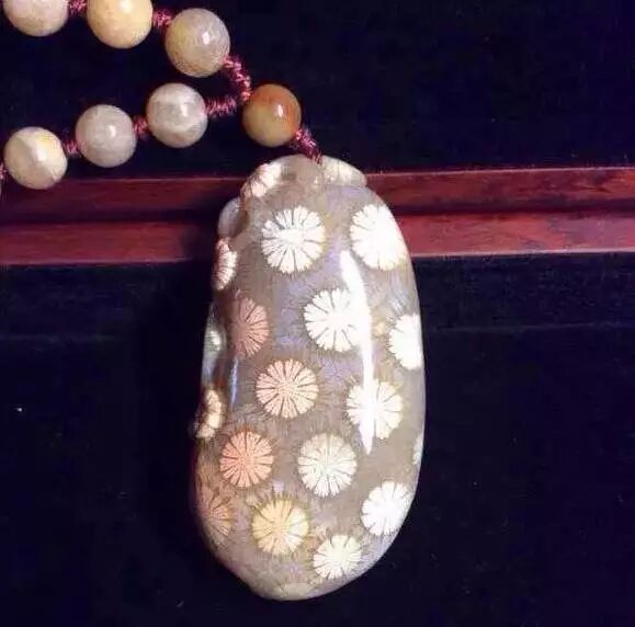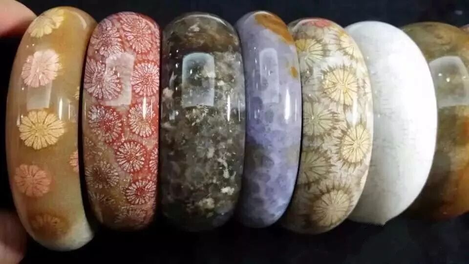 珊瑚玉最大的特色就是它的花纹,在被横切之后,可以看到规则的菊花状花纹。由于珊瑚大小、品种的差异,花纹也会不同,疏密分布错落有致,颜色各种各样。