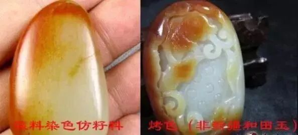 即使能染色到一定厚度,假和田玉的颜色还是最外面的最深。下面放两张图,感受一下: