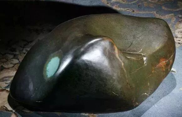 这块玉重64.6公斤,长47.6厘米,宽36.6厘米,高24.3厘米,从外观上看通体裹深色皮色,玉石上面开了三个小窗口,露出来的玉石颜色青色中略微偏蓝。