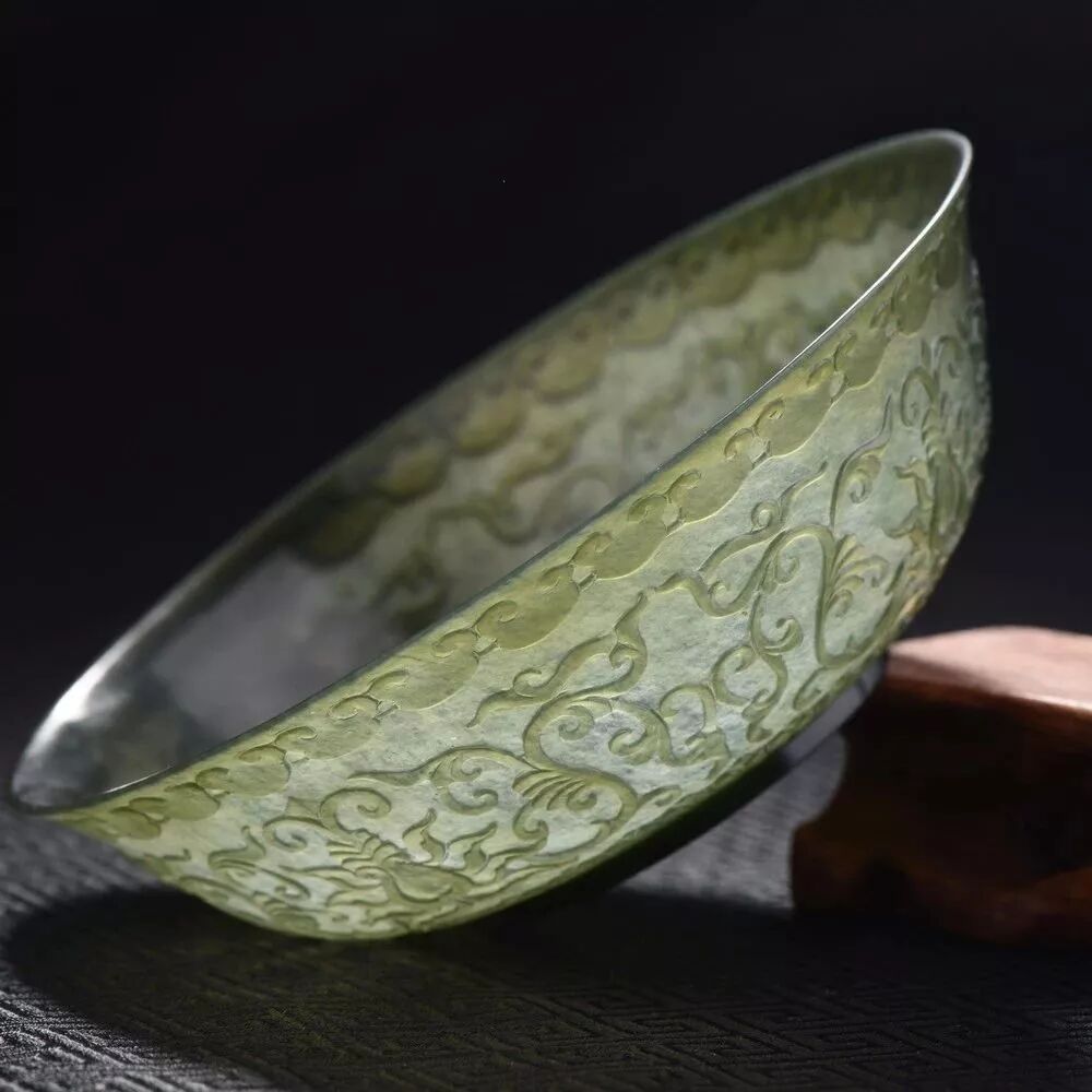 在薄之上,加了浮雕、圆雕、镂空雕等多种工艺组合,使玉器雕琢由内透过器壁能看到外壁上浮雕的各种花纹图案,拿在手上虽轻但巧,有梦幻之感。