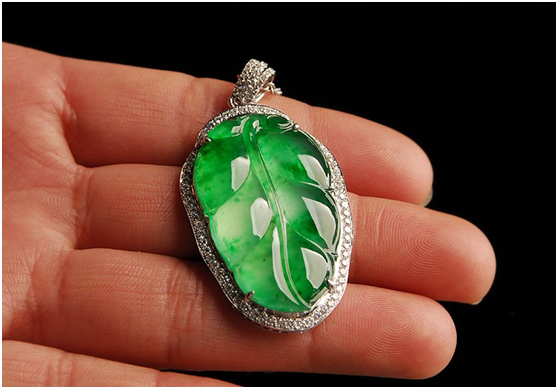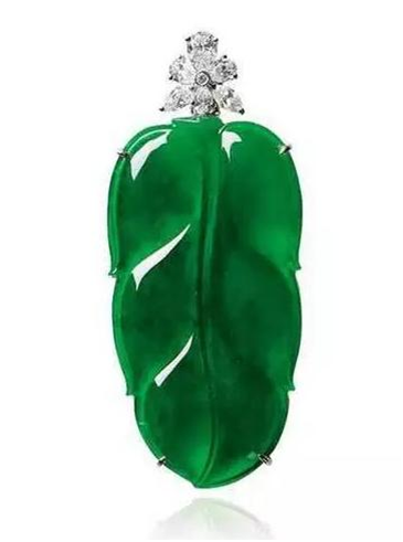 缅甸天然翡翠配钻石树叶挂坠,