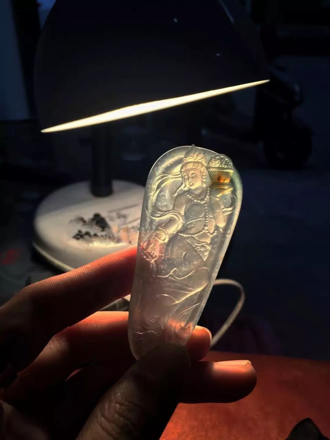 雪花棉给整体的感觉增添了韵味,大自然的鬼斧神工加上雕刻师傅巧夺天工的玉雕技术,真是惟妙惟肖啊,像这样级别种水料子非常的难得一见,极品了,观音是佛教中慈悲和智慧的象征,有求必应,降福世人,吉祥如意