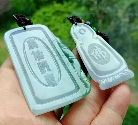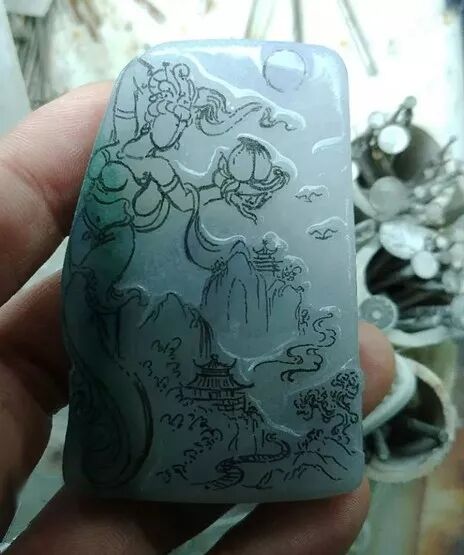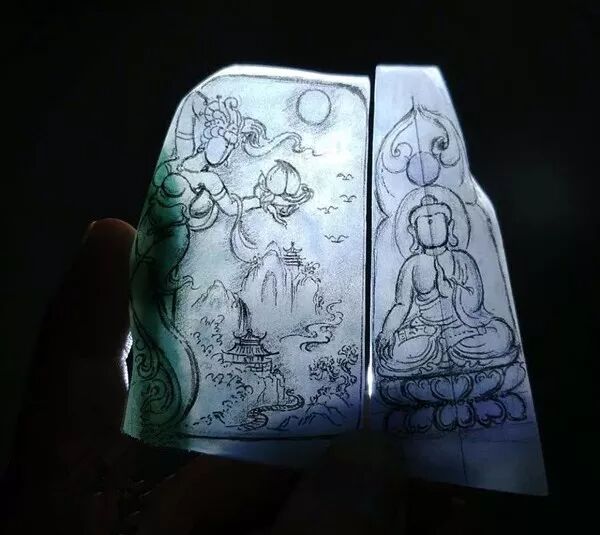 这块片料是取自老坑会卡场口的料子,质地达到冰种了,绿色集中在左下方,因为做一个牌子的话有点大了,所以决定做两件牌子!