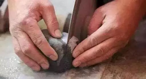 下刀切石首先是部位要找准,一般是从擦口处下刀或是从颟上下刀,还可以从松花或是顺裂纹下刀,当切第一刀不见颜色时,还可以切第二刀,第三刀,行话说:“一刀穷,一刀富”,指的就是这个道理。