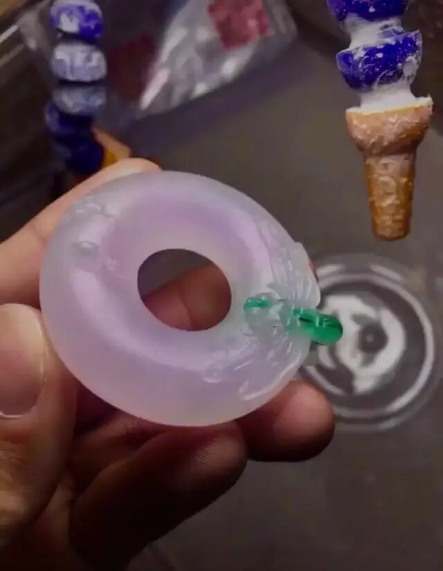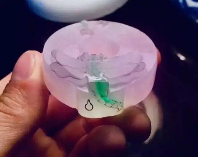 将镯芯里面掏空,想做一个平安扣的形状,雕刻师傅设计的是蜻蜓,寓意青云直上,蜻蜓的身体细长、轻盈,象征女性之美!