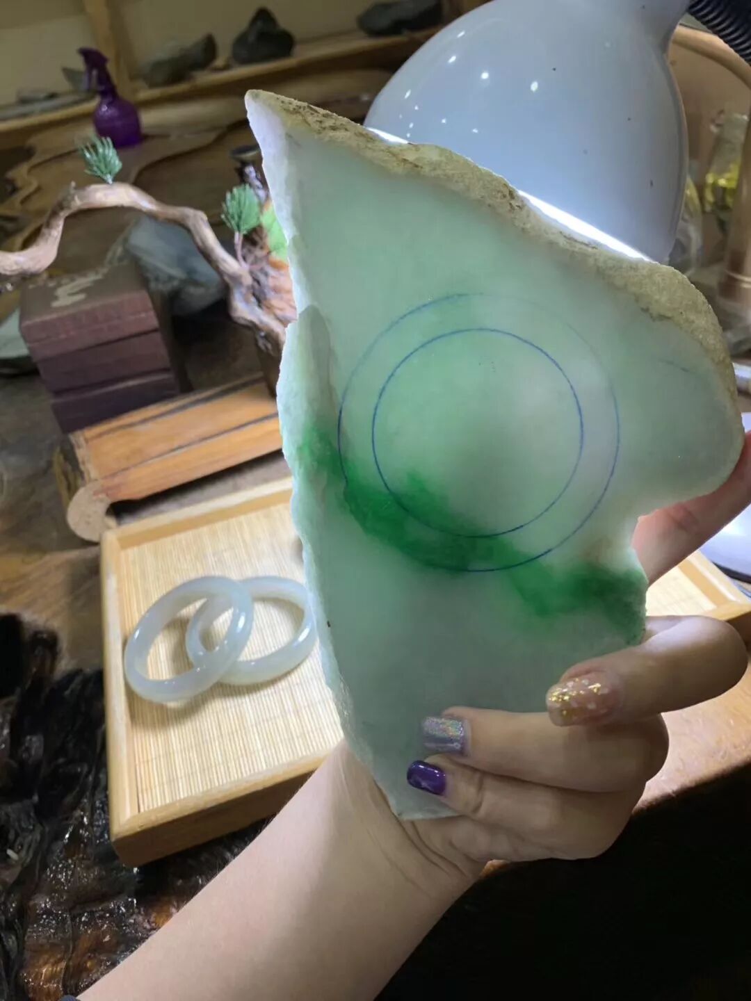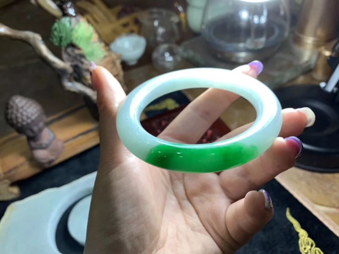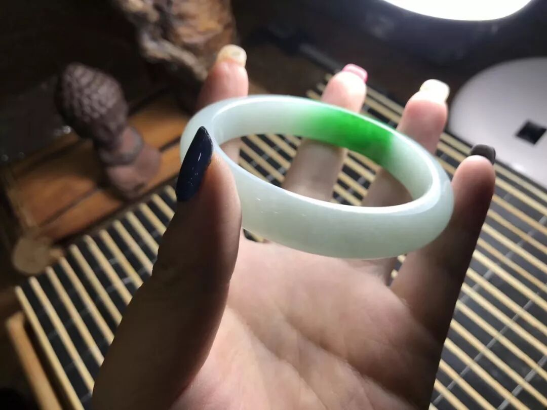 一个星期后,成品终于出浴了,阳绿手镯,起货效果还是非常理想的,完美圈住几抹阳绿,种水非常好,清爽干净,水润无暇,阳绿色娇翠欲滴。