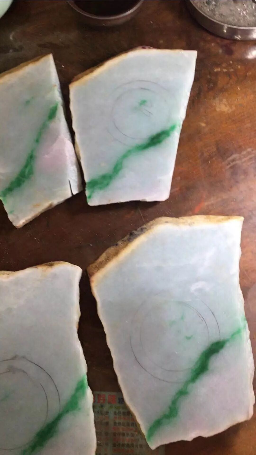 切下来的片料,片片有色,片片有手镯位,灯下观玉,肉质细腻,还带有一滴滴的春色呢,哇,真的太幸运了吧,接下来就等待出货效果吧!