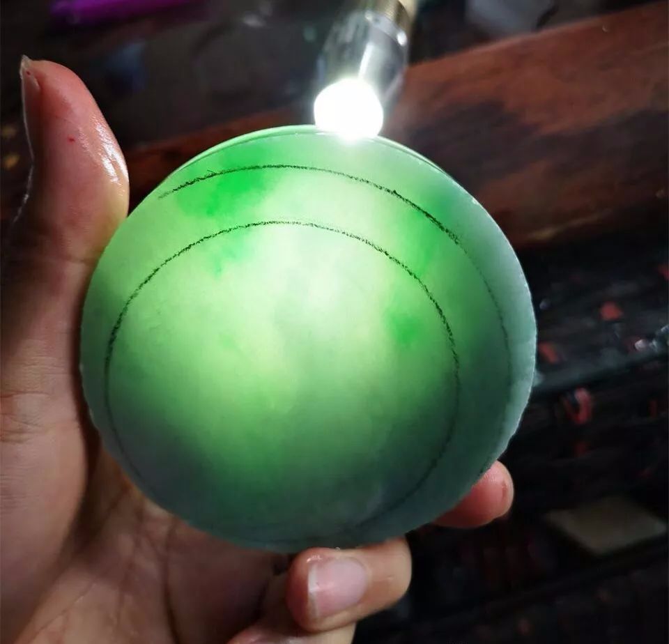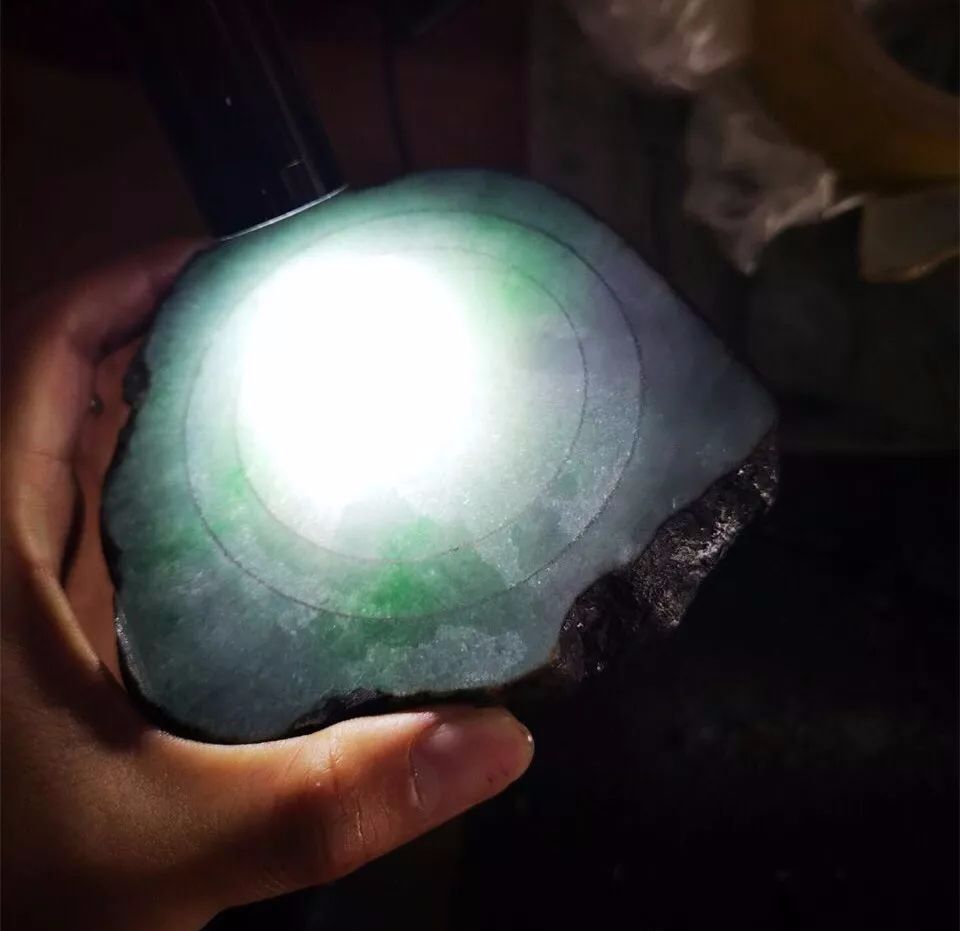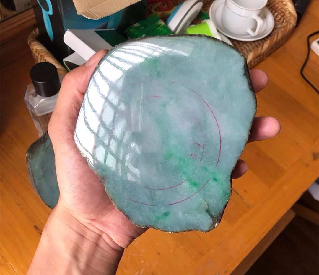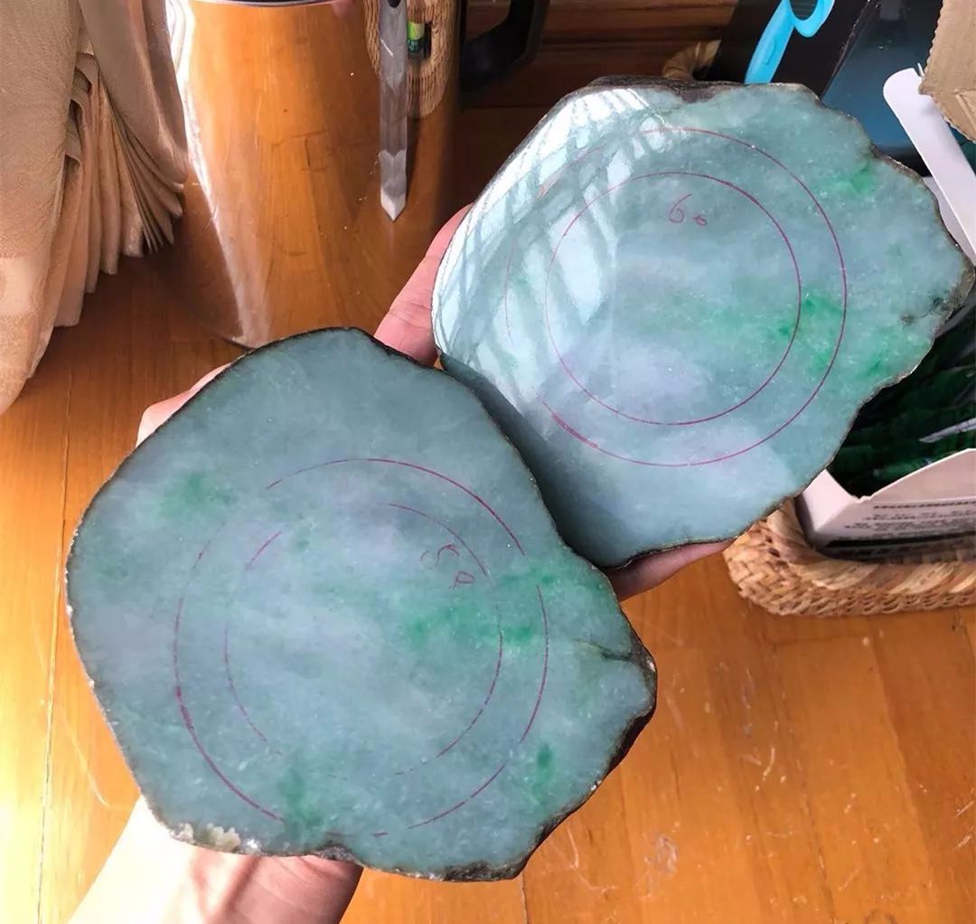 切成片料之后的样子,透光看很漂亮,师傅先画了一个手镯位,借到了部分绿色。