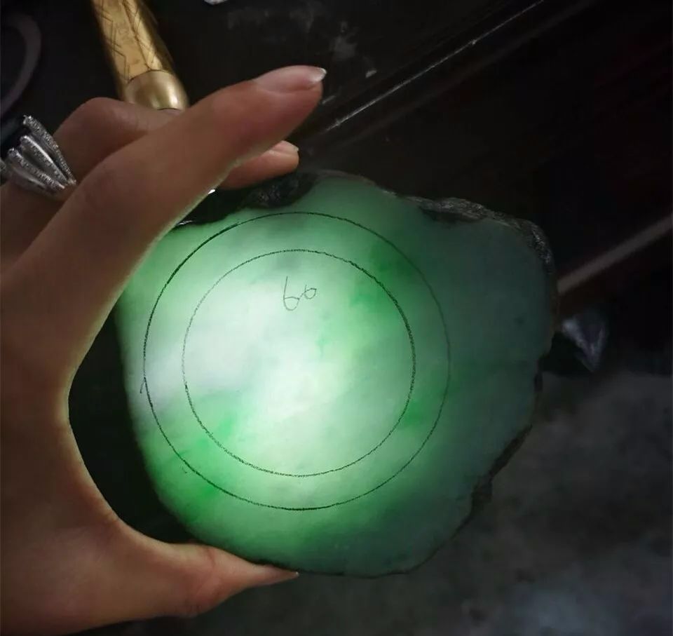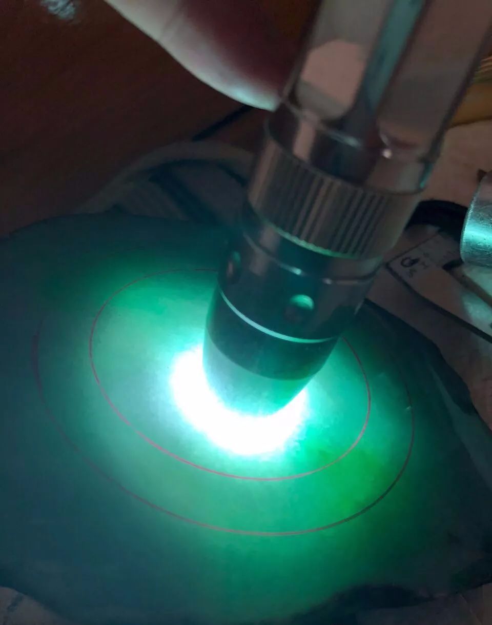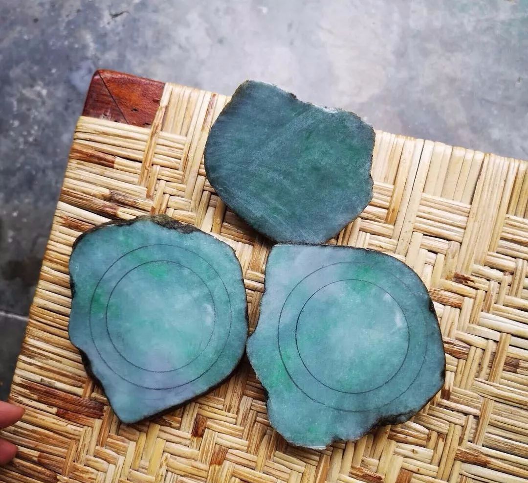 切成片料之后的样子,透光看很漂亮,师傅先画了一个手镯位,借到了部分绿色。