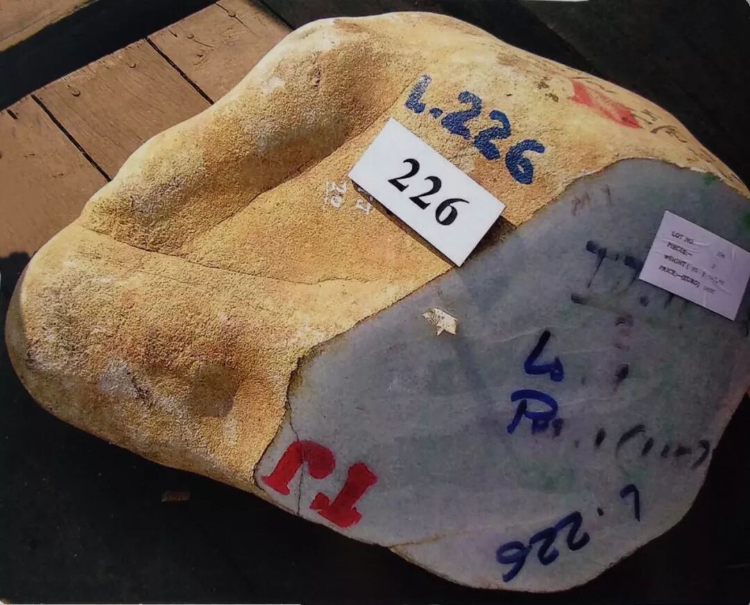 如果皮壳像金刚砂磨刀石那样——就是特别好的水翻砂。它的砂层很薄,砂搬得很细、很匀、很紧,刺手感相当强,而且雾饱,玉石的肉头会特别细腻,种水会特别好,而且特别受光。面对这种水翻砂的赌石,无需考虑皮壳上是否还有其他表现,都值得去赌,即便没有色,单凭地子的白肉也是很有价值的。