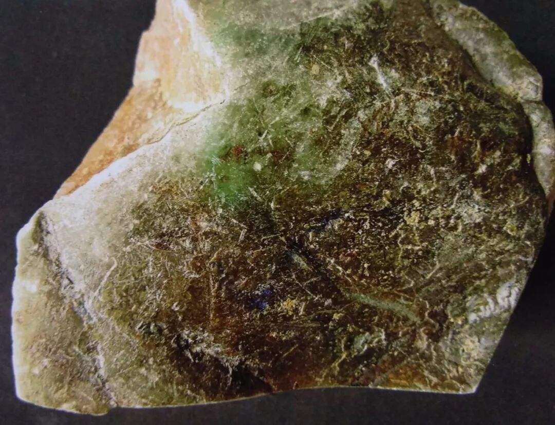 而深埋作用就不同了,当铁石脚层被上覆沉积物埋藏得相当深、相当紧密时,翡翠砾石就会处于地下水面之下的还原环境中,其温度和压力也会超过常温长压,因而时常会有低温热液的活动。此时,翡翠砾石所遭受的变化就复杂多了,其表层的硬玉矿物不仅发生水解作用、水合作用、而且还会发生交代作用,其间既有自身元素的带出,也有外来物质(镁、铁)的加入,于是便形成了另一种次生矿物——柯绿泥石,从而构成了乌沙石皮壳的矿物组合,由于柯绿泥石的颜色为绿色、绿黑色、深灰色、黑色,因此乌沙石的皮壳就以黑色调为主,这就是将乌沙石与山石分为不同玉石类型的缘由。