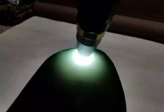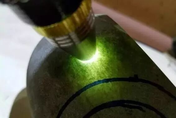 这是一块后江场口的原石,后江素以色料闻名。隔着皮壳打灯看看,是水头非常好的春彩料子。多处表现非常好。