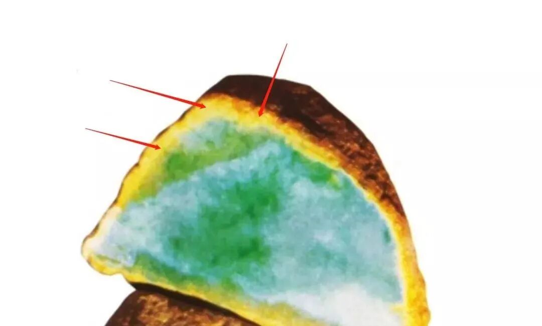 黄雾显示其内的铁元素和其它元素正在渐渐氧化,但还没有严重氧化。若为纯净的淡黄色的雾,显示杂质元素少,常出现高翠,但有时因铁离子产生的蓝绿色调可能进入翡翠的晶格,也出现微偏蓝绿色调的绿。但也可能致使翡翠内部出现灰地。由于具有一定厚度的红雾能够掩盖翡翠原石的内部颜色特征,所以一般情况下是没办法根据红雾来判断赌石内部的颜色情况。
