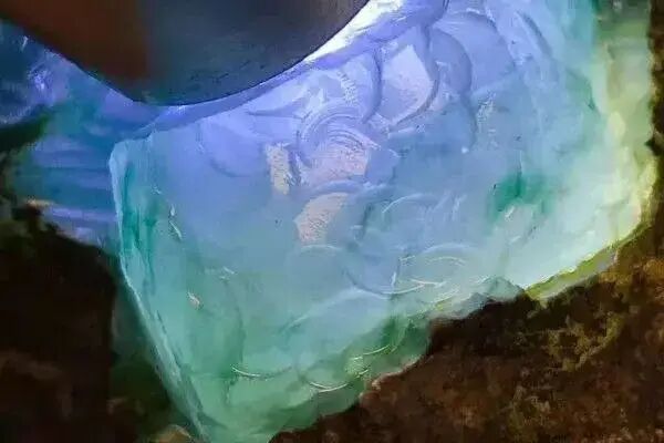 压灯一看,带有底色,非常漂亮,这样看上去就已经是收藏级别的了,颜色真是五颜六色,有紫罗兰,绿色,白色,可以说是一块三彩翡翠原石,肉质也是已经达到果冻级别。