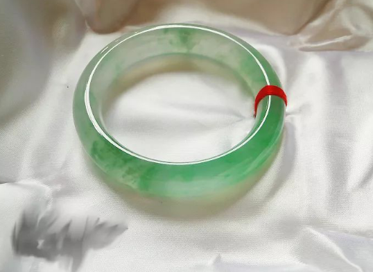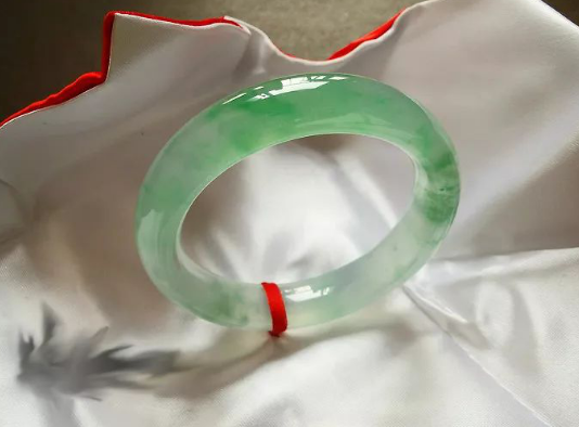 翡翠玉镯莹润细滑,晶莹剔透,强荧光,质地细腻且精致,起胶味,底子干净清澈。