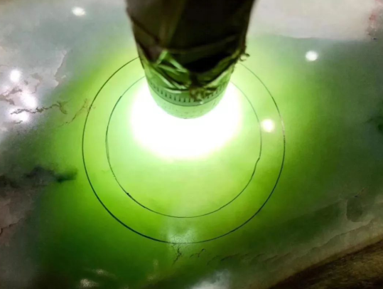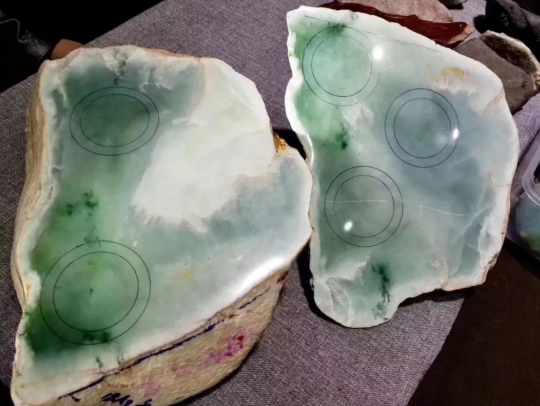 即便边缘有一些裂纹,也没有影响取货,仅仅这只切了这一刀,已经有5个手镯位了,可以想象这块料子能够取出十多条手镯。