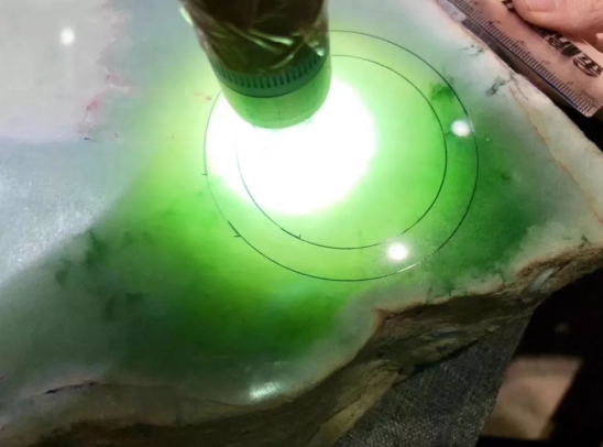 首先,我们来打灯看看,可惜原石的皮壳很厚,即使打灯也没有看到任何的表现,根本猜不透里面到底有什么,货主也紧张了,毕竟花了1万买下的料子,不要全部赔进去啊。货主决定直接切料,一了百了。