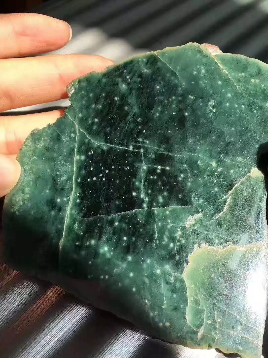 近距离看,除了有裂这个缺点,肉质还算细腻的,颜色均匀,色泽柔和,似蓝色之幽灵,美丽而富有遐想。