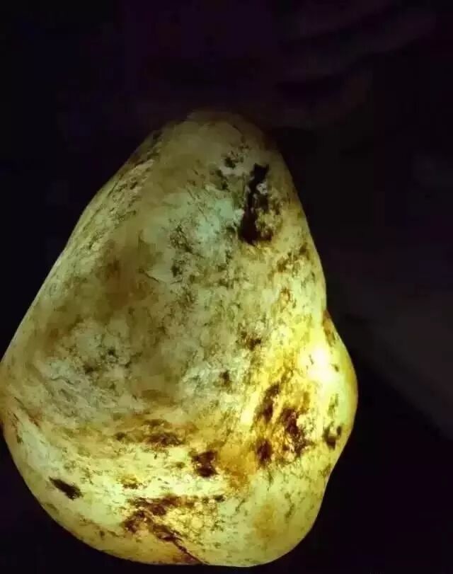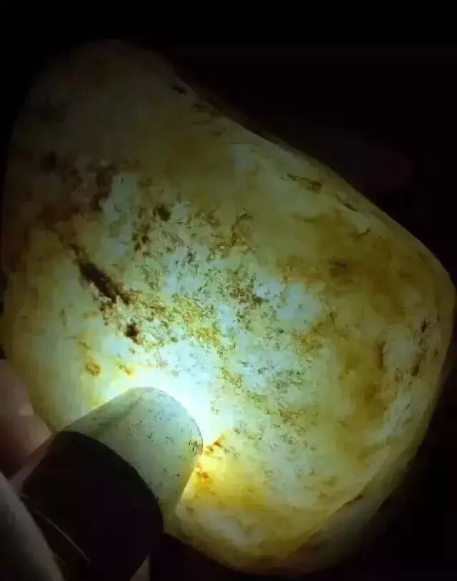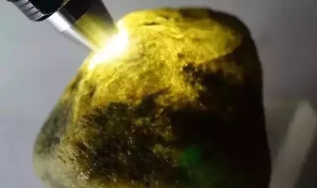 山石,皮黄如黄梨,皮薄,微微透明。打光即可看见内含的颜色,切割后,绿色黄味足,显鲜亮活放。是大马坎最具代表性的块体!含色率高,多为上等玉石料。