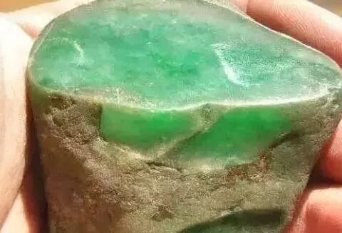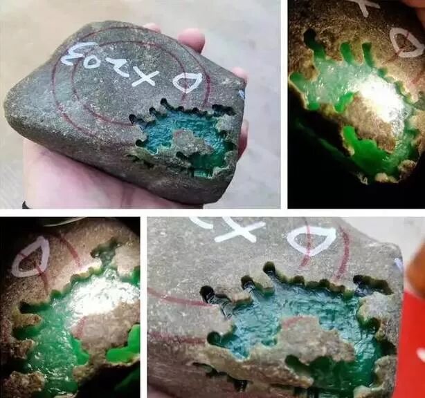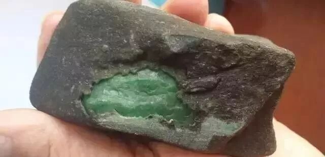 山石,表皮有铁锈色,它可以出现在不同颜色的沙壳上,一条条宽窄不等,有的是片状走向,有的是块状。铁锈壳如果沙粒适中,翻得有力而规整,切割后底和色都好,不怕底灰,只怕无色,一经有色,色必是又翠又水。但要注意,多数底灰,如果是高色,则必是上品。主要产自老场区的东郭场口。