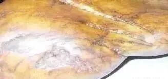 山石,表皮有水锈色,一片片或一股股,少数呈黄色或黄灰色。多见为老石种,颜色黑、黄、灰都有,但沙粒一般不太好,因为出产这种水翻沙的场口比较杂乱,底水一般,主要区分点是皮上有无水锈。有代表性的是会卡的萍皮水翻沙。要特别注意,其沙是否翻得匀称。会卡的水翻沙皮子很薄,可以借助光亮透过皮子照色。