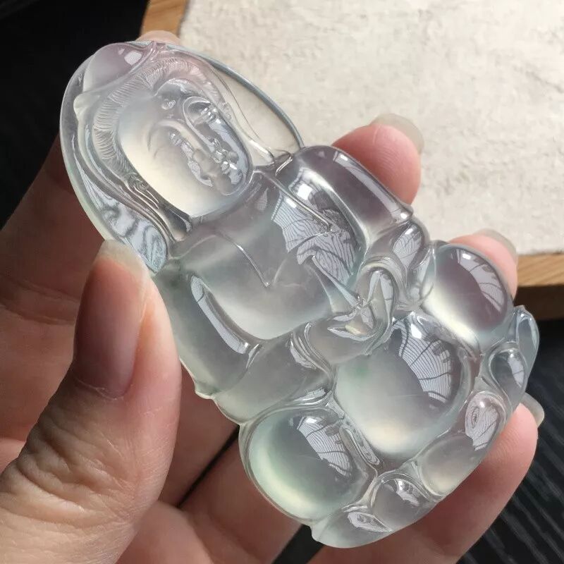 顾名思义,似玻璃、水晶那样清亮、晶莹透明的翡翠被称为玻璃种翡翠,它是种纯净度很高,其结晶颗粒细微到隐晶的聚合体,致密而坚实,抛光呈玻璃面,你可以看到它侧方泛出微微带有点绿头感或蓝味的荧光,此荧光越强说明其种质越好,坚韧度也要比一般翡翠料高。