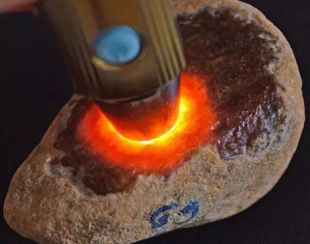 这是这块出自南齐场口的原石料,窗口已经擦开,灯光下透着鲜红色,颜色特别正,重0.89公斤,是一块冰种红翡。