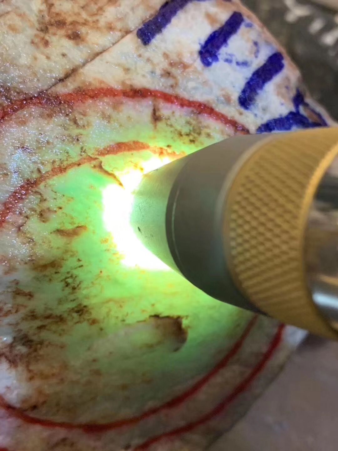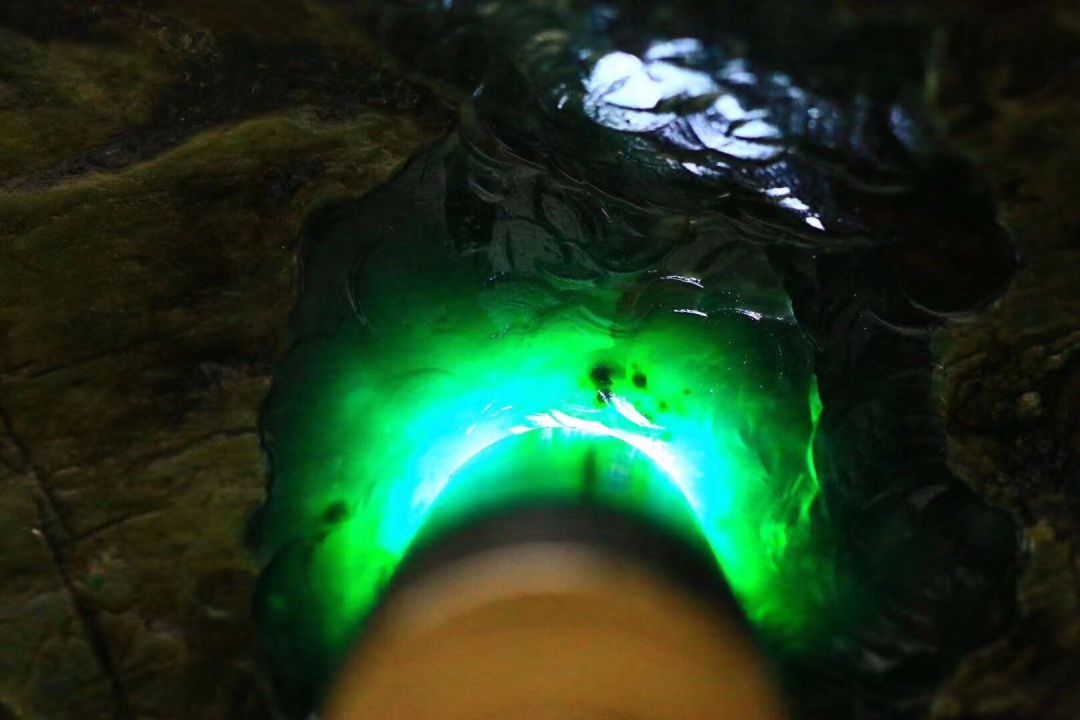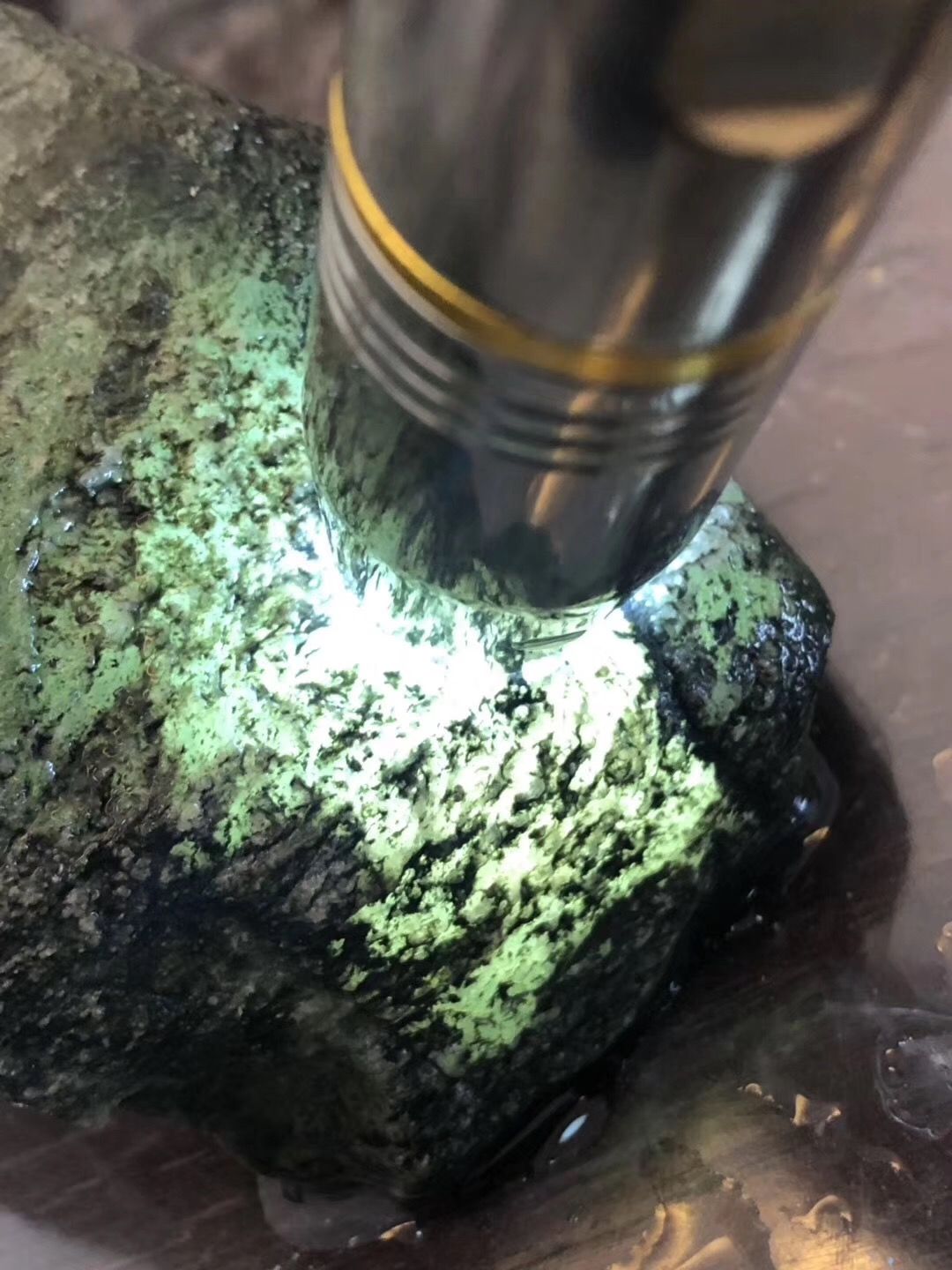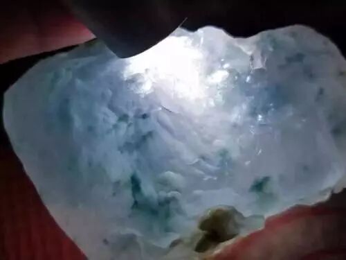 1、购买翡翠毛料时要带强光手电筒照射翡翠,强光的手电筒能够看到内部的种水好坏以及是否有瑕疵等,但是不能靠强光下的绿色来判断绿色是鲜艳还是暗淡。任何的颜色在强光的手电筒下都会有迷人的色彩,真正的颜色还是要等切开翡翠原料后才能知道。