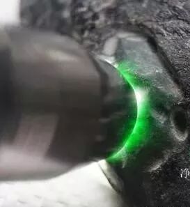 黑乌纱赌石表层的这些绿泥石粘土质物质在漫长的地质时期还会沿翡翠的矿物颗粒间隙和开放性裂隙逐渐往翡翠砾石的内部渗透,在翡翠砾石的近表层形成一层厚度不等的灰绿色~暗绿色的次生绿色层,行内称为 “绿雾”。