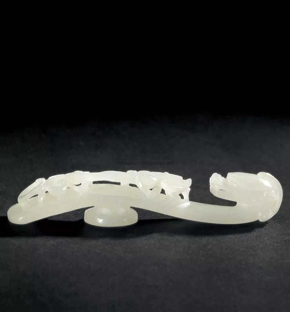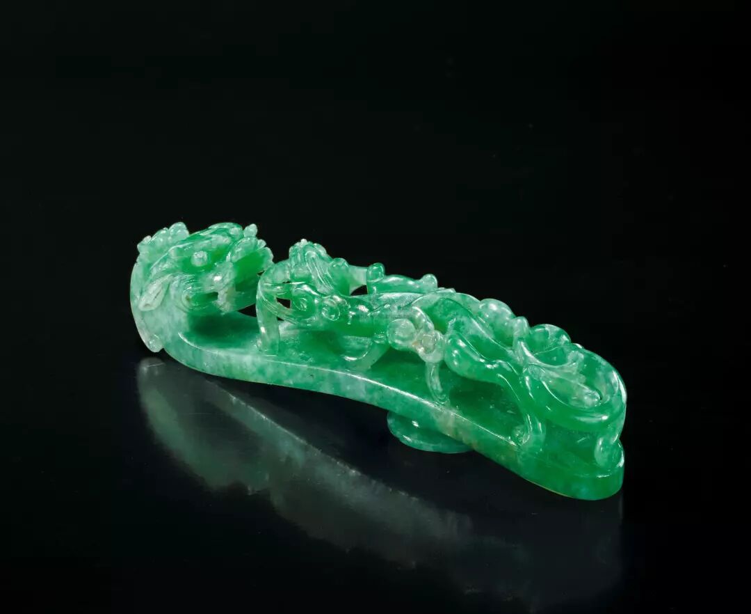 翡翠龙钩始用于清朝,龙钩子上的螭首及螭虎多采用透空雕的技法,使得龙钩玲珑剔透、栩栩如生。